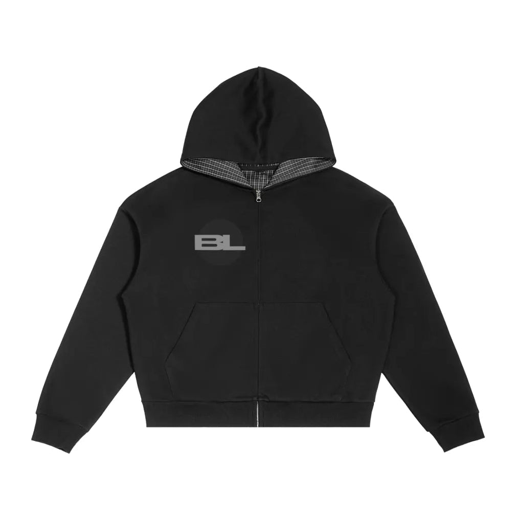 BLUEPRINT CONTRAST PLAID BOXY ZIP-UP HOODIE BLACK